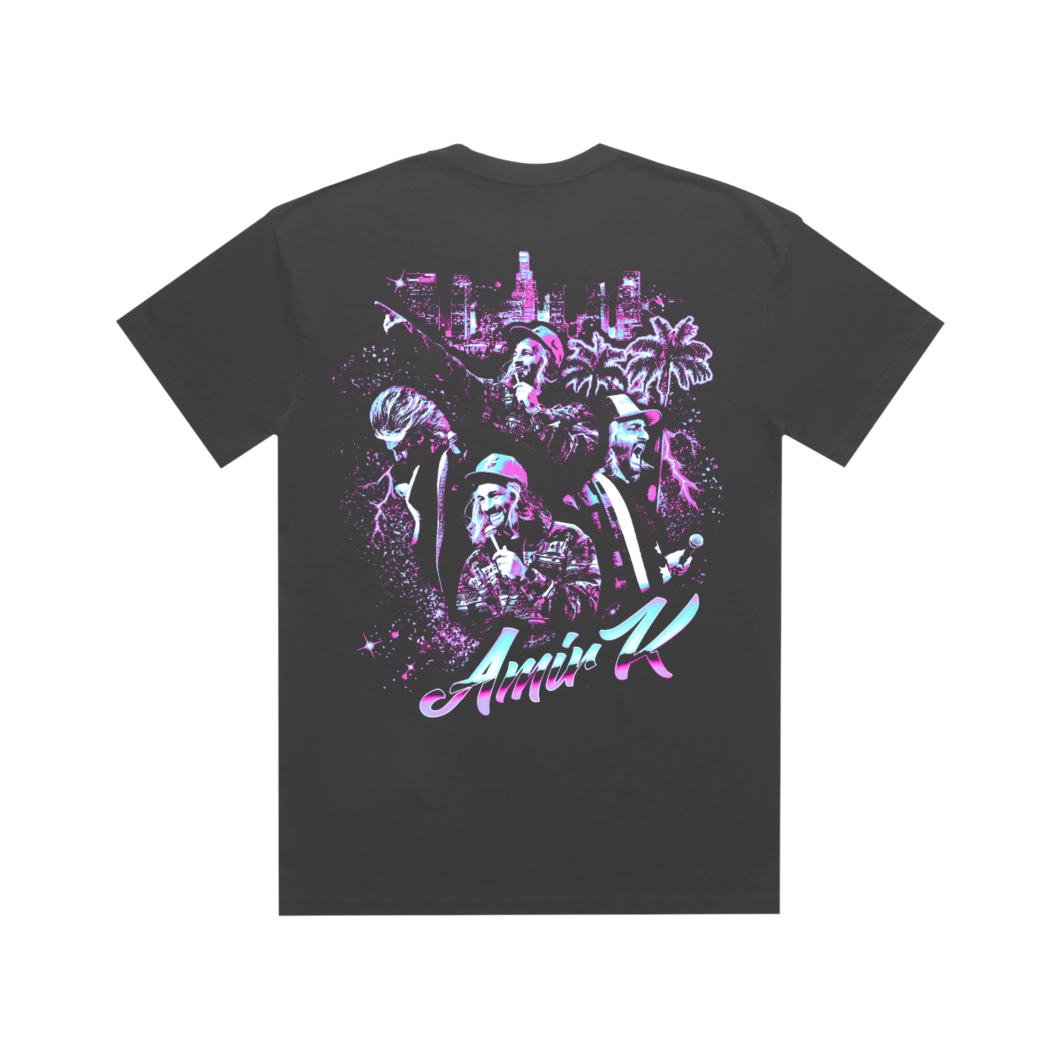 Each shirt features bold, retro-inspired artwork showcasing Amir K in full performance mode, backed by palm trees, lightning, and the L.A. skyline, a tribute to his high-energy stand-up and California roots.